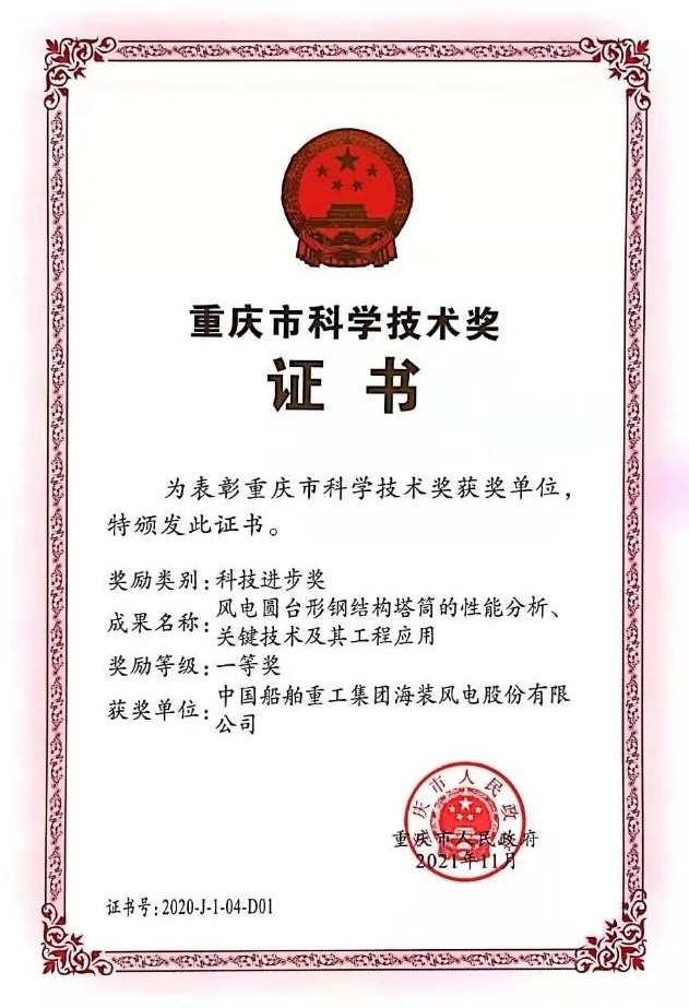 中國(guó)船舶集團(tuán)旗下中國(guó)海裝申報(bào)的兩項(xiàng)成果《高效安全大型風(fēng)電機(jī)組傳動(dòng)鏈關(guān)鍵技術(shù)與應(yīng)用》《風(fēng)電圓臺(tái)形鋼結(jié)構(gòu)塔筒的性能分析、關(guān)鍵技術(shù)及其工程應(yīng)用》榮獲重慶市科技進(jìn)步獎(jiǎng)一等獎(jiǎng)。