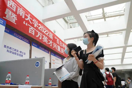 圖片▲在位于重慶市北碚區(qū)的西南大學,應屆畢業(yè)生參加“百萬英才興重慶”招聘會(2022年5月13日攝)。用人單位提供了涉及教育、人工智能、汽車制造等領域的3000多個崗位供畢業(yè)生選擇。新華社發(fā)(秦廷富 攝)