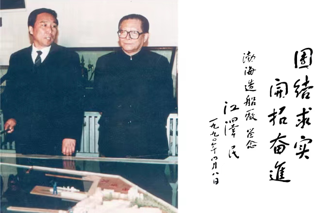 1990 年4月8日,江澤民同志視察渤海造船廠并題詞“團(tuán)結(jié)求實,開拓奮進(jìn)”。