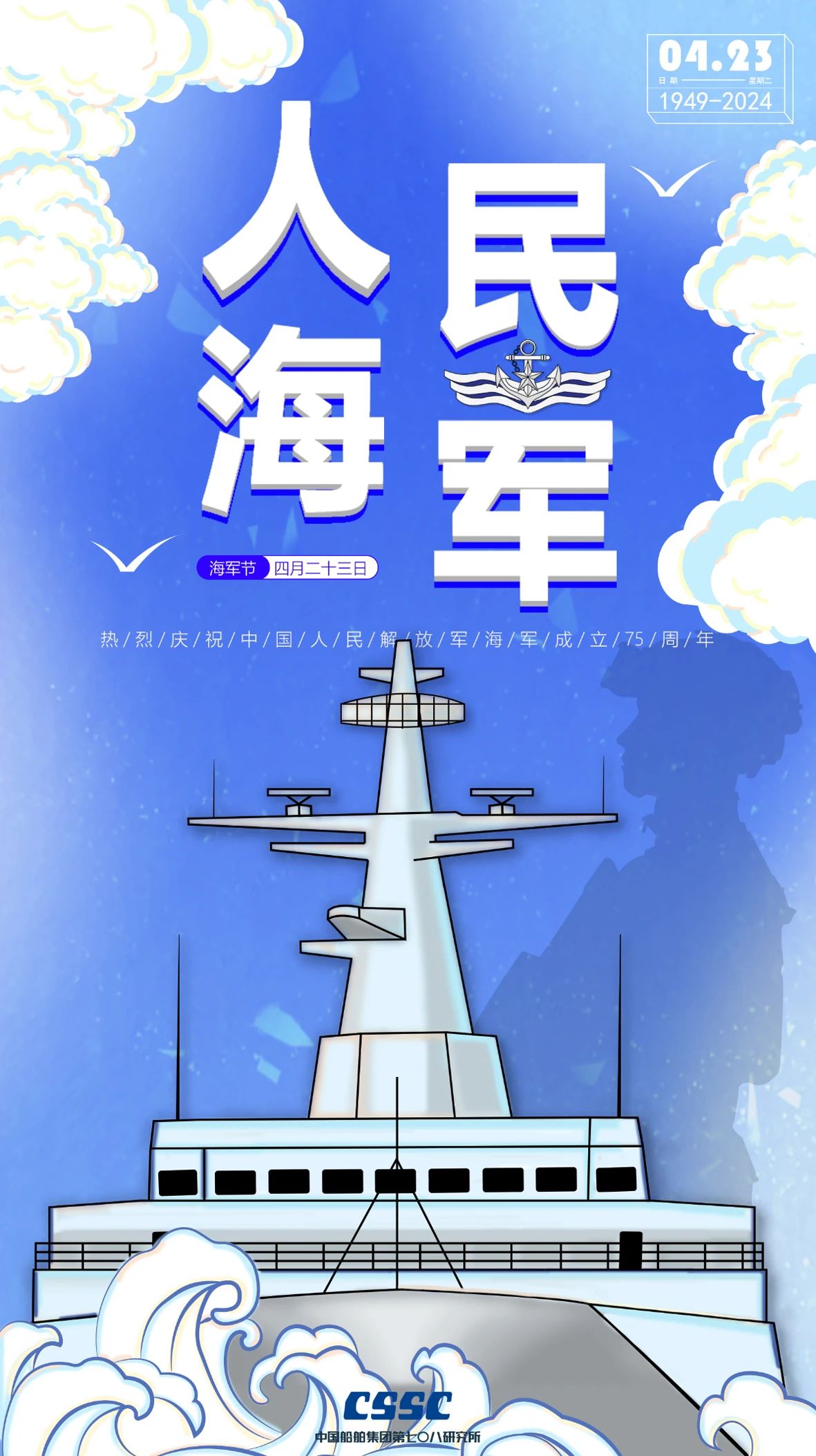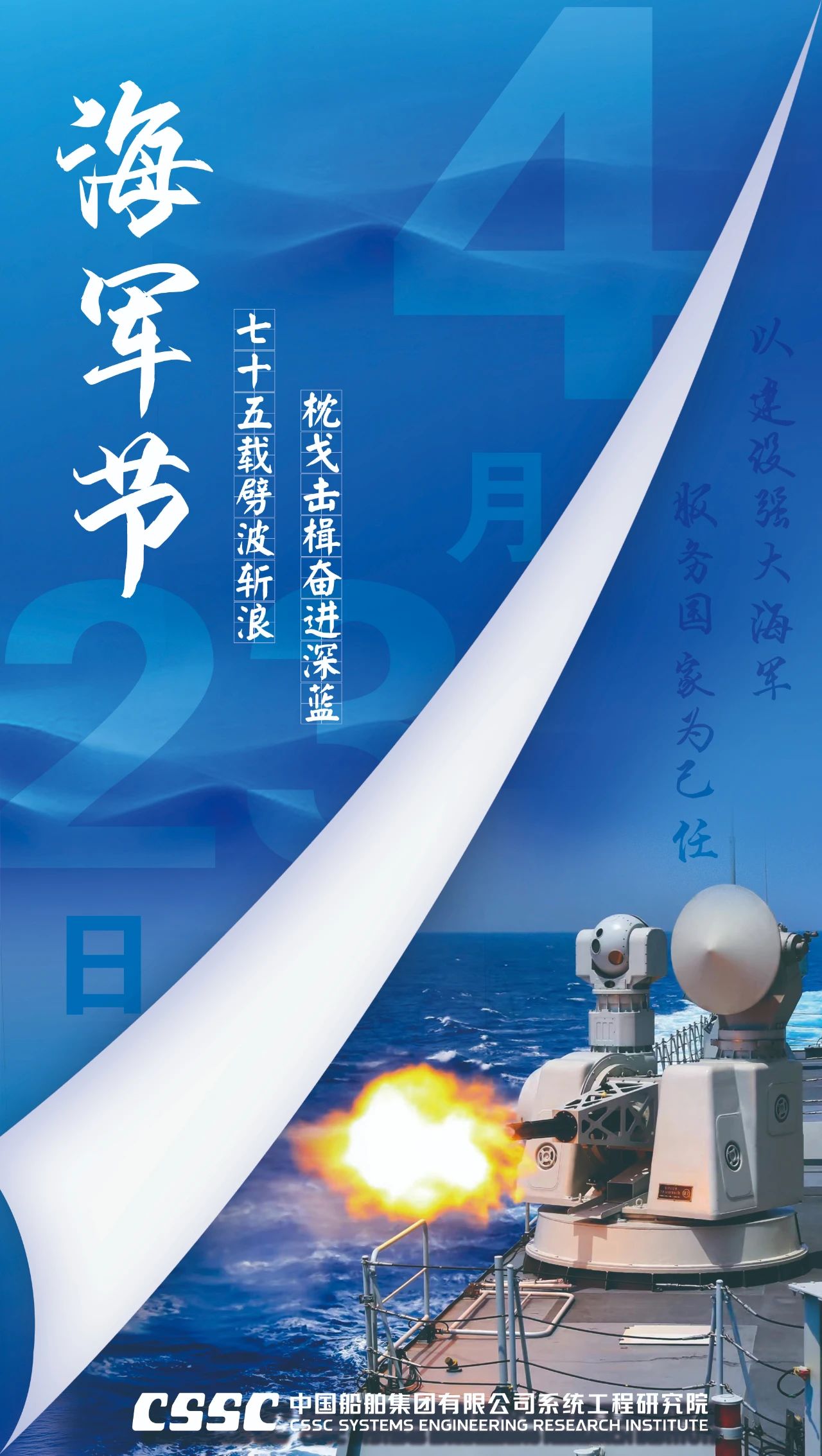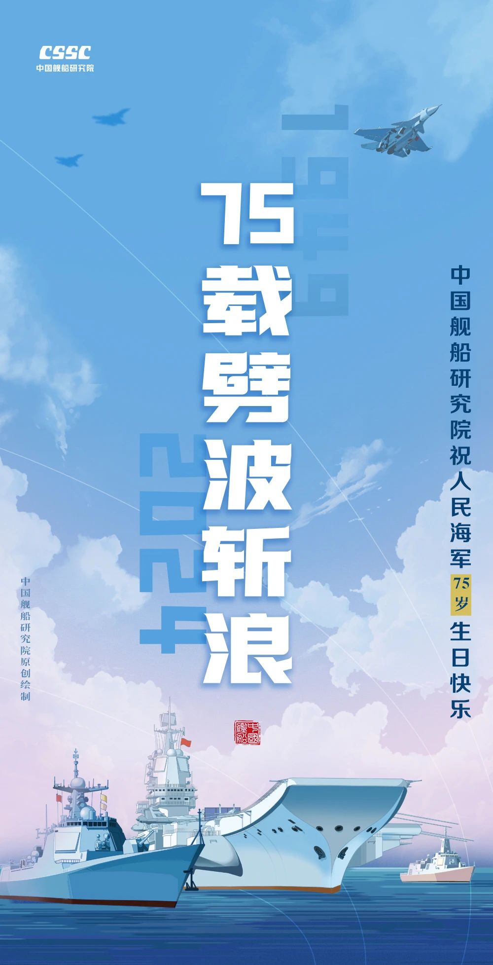 人民海軍 七十五載風雨歷程 向海圖強 乘風破浪逐夢深藍 ——大連造船(姜秉尚) ——七院(任娟) ——七〇八所(曹璐、宋卓璟) ——武昌造船(丁慧 、周建仁) ——系統(tǒng)工程研究院(邵鴻飛、姬國偉) ——廣船國際(董入豪) 英雄的艦隊向前方 筑起萬里鋼鐵海疆