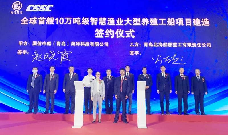 ????6月3日,中國船舶集團(tuán)有限公司旗下武船集團(tuán)青島北海船舶重工有限責(zé)任公司與國信中船(青島)海洋科技有限公司在青島西海新區(qū)正式簽署全球首艘10萬噸級(jí)智慧漁業(yè)大型養(yǎng)殖工船的建造合同。本次簽約標(biāo)志著養(yǎng)殖工船項(xiàng)目正式進(jìn)入實(shí)質(zhì)性建造階段,該船將于2022年3月交付。中國船舶集團(tuán)黨組成員、副總經(jīng)理孫偉,青島市副市長(zhǎng)耿濤等領(lǐng)導(dǎo)和嘉賓出席簽約儀式。