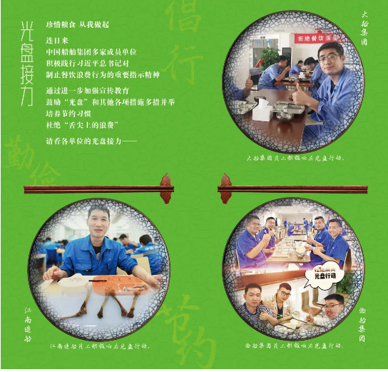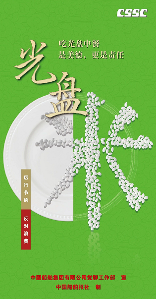 為認(rèn)真貫徹落實(shí)習(xí)近平總書記關(guān)于制止餐飲浪費(fèi)行為的重要指示精神,大力弘揚(yáng)中華民族勤儉節(jié)約、珍惜糧食的文明用餐習(xí)慣,中國船舶集團(tuán)積極開展“制止餐飲浪費(fèi) 踐行光盤行動”專項(xiàng)宣傳引導(dǎo)活動。