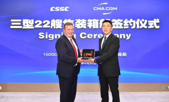 4月30日,中國船舶集團旗下中船貿(mào)易攜手江南造船、滬東中華、北船重工聯(lián)合承接法國達飛海運集團3型22艘集裝箱船訂單,中國船舶集團黨組成員、副總經(jīng)理孫偉,達飛集團執(zhí)行副總裁澤維爾出席簽約儀式。