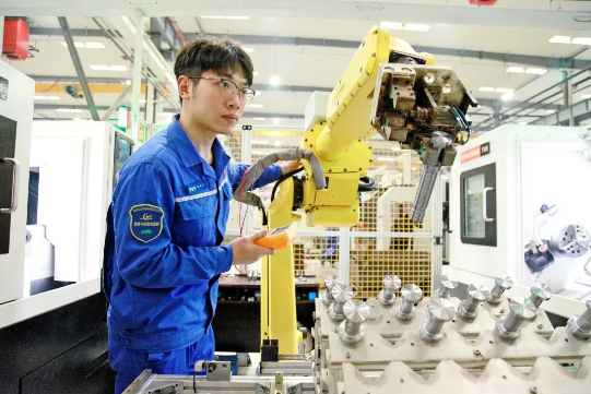 在總裝車間,TA替代人工為風電機組的偏航軸承擰緊螺栓。一百多顆螺栓,兩個人花上2個多小時才能擰完,TA只需40分鐘。TA可用激光識別、校準每一枚螺栓的位置,而且擰緊每一顆螺栓的力度都有記錄可查,真正實現(xiàn)了全自動、無人化的操作,且產品質量得到了充分保證。