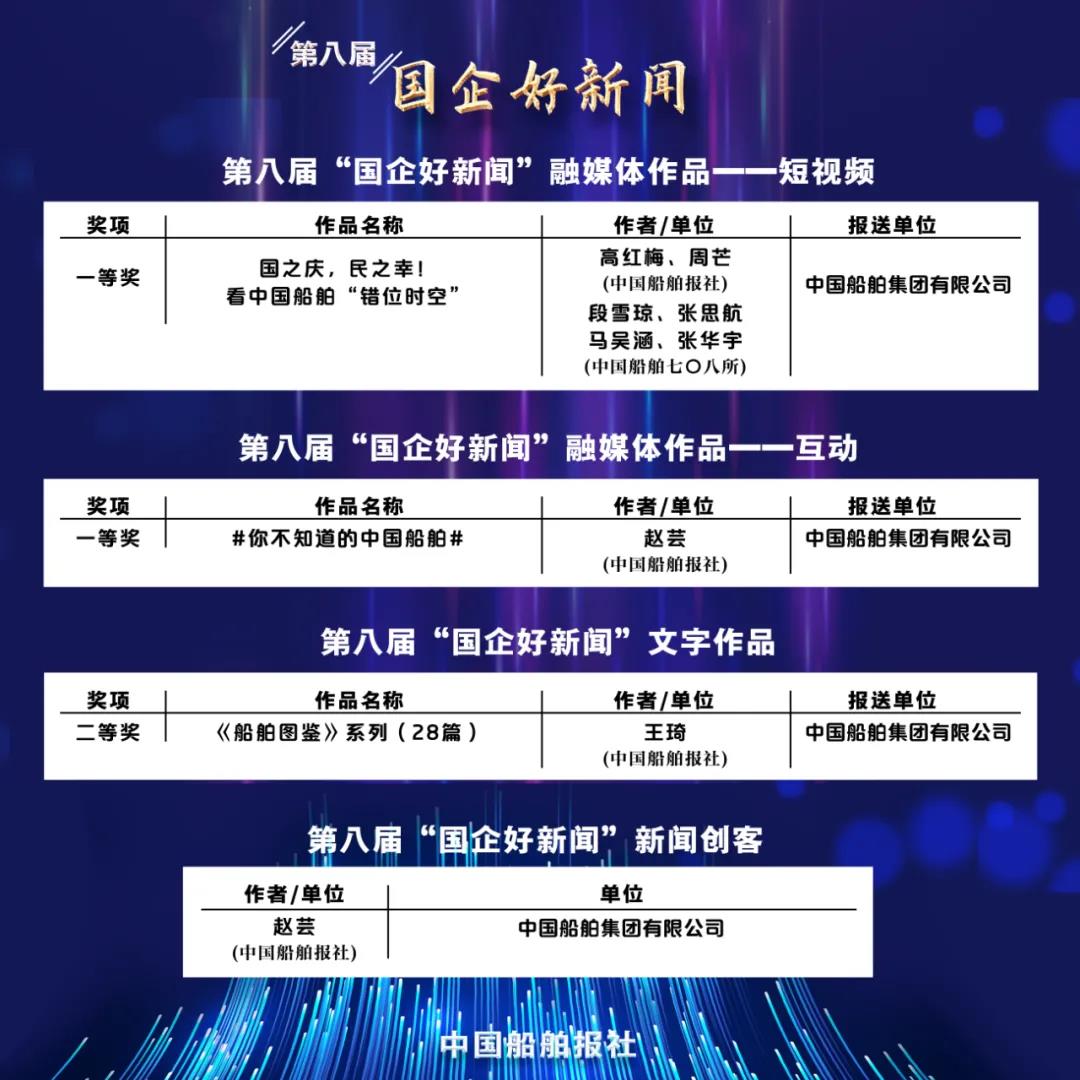 1月11日,第八屆“國企好新聞”獲獎作品正式揭曉,中國船舶集團斬獲4項大獎,涵蓋系列報道、短視頻、融媒體作品等多種體裁。其中,一等獎2項、二等獎1項,并首次榮膺十大新聞創(chuàng)客獎,獲獎名單如下: