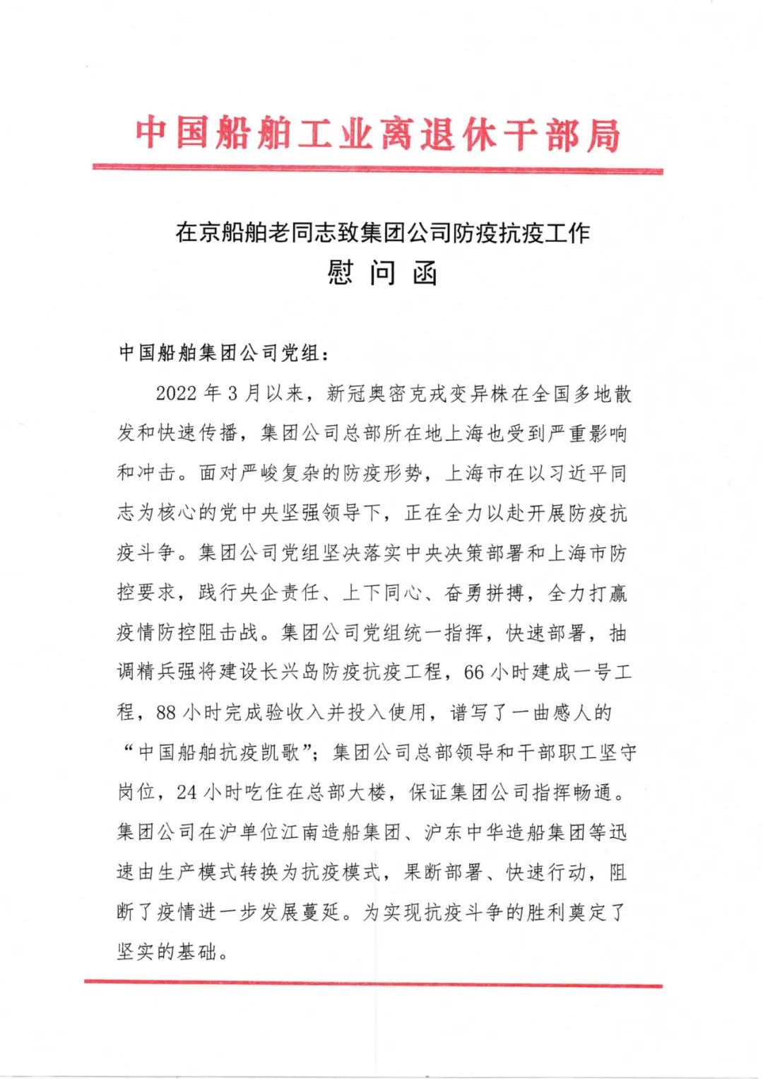 抗疫形勢嚴峻復雜,中國船舶集團離退休老領(lǐng)導老同志關(guān)注抗疫、心系集團,為干部職工加油鼓勁。