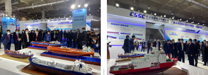 在創(chuàng)新船海裝備展區(qū),中國船舶集團(tuán)集中展示了清潔能源船舶、系列LNG船、系列集裝箱船、系列油船、系列散貨船、系列科考船、系列特種船和未來船舶八個板塊。