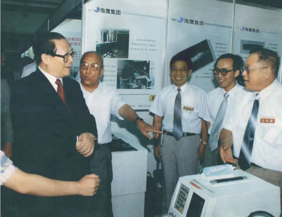 江澤民同志曾參觀系統(tǒng)工程研究院、中船電科旗下海鷹公司產(chǎn)品。圖為1995年,江澤民同志參觀海鷹公司展臺。