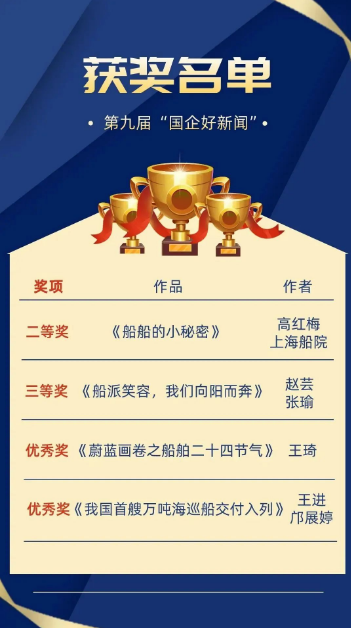 近日,第九屆“國企好新聞”獲獎作品正式揭曉,中國船舶集團(tuán)斬獲4項大獎,涵蓋科普類、影音類、圖片類、文字類等多種體裁。其中,二等獎1項、三等獎1項、優(yōu)秀獎2項。