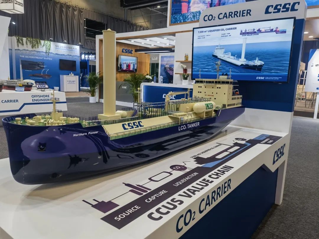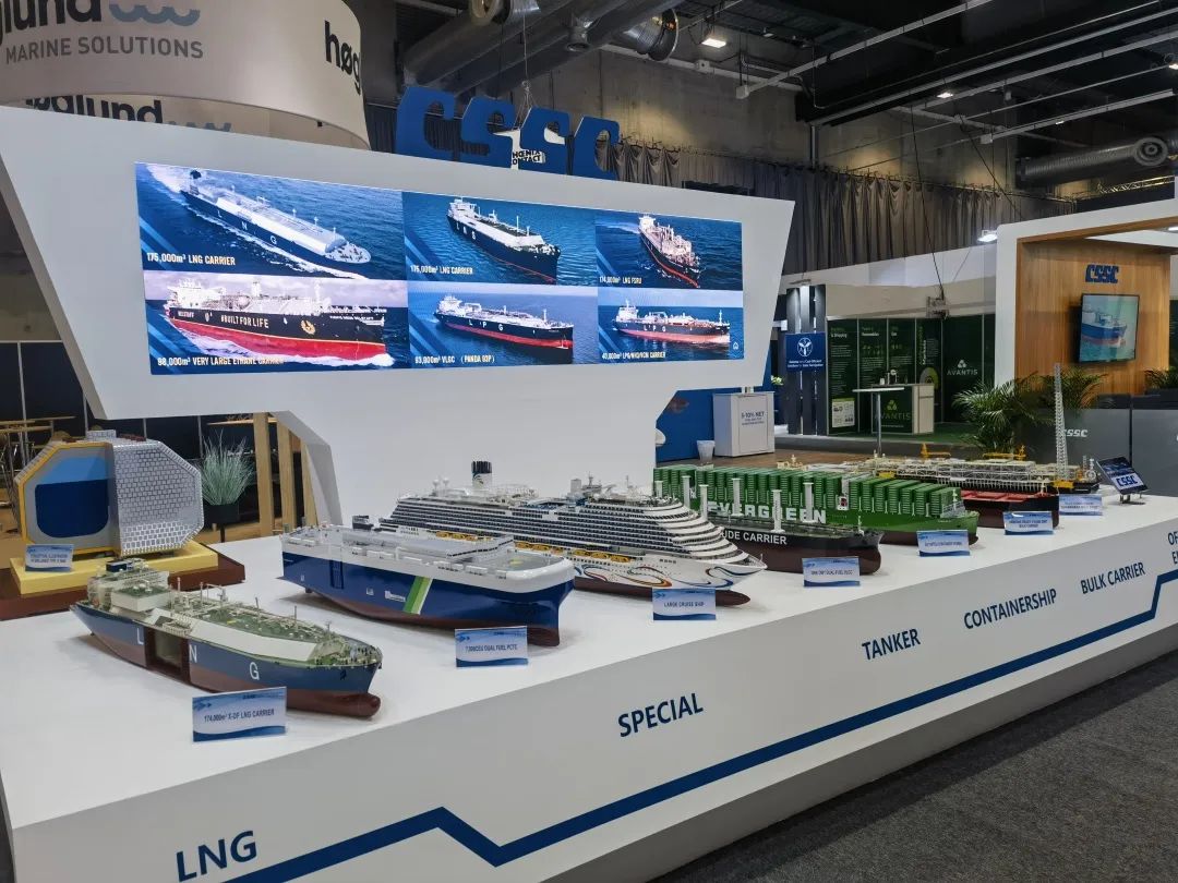 本次展會,中國船舶集團積極踐行“走出去”發(fā)展戰(zhàn)略,緊盯目標市場特點和需求,重點展示了近年來船舶海工及動力機電產(chǎn)品在綠色、低碳、環(huán)保方面取得的最新進展和相關(guān)成果,包括全球首制7500立方米液態(tài)二氧化碳運輸船、17.4萬立方米大型LNG運輸船、7000CEU雙燃料汽車滾裝船、23000TEU超大型雙燃料集裝箱船、21萬噸氨燃料散貨船、30萬噸級FPSO、全球首艘10萬噸級智慧養(yǎng)殖工船,以及 12X92DF雙燃料低速機、LNG供氣系統(tǒng)、船用碳捕捉系統(tǒng)等。集團公司展臺吸引了眾多國內(nèi)外知名船東、船級社、設(shè)備廠商等到訪觀摩,交流了當(dāng)前市場熱點并探討了未來合作機遇。