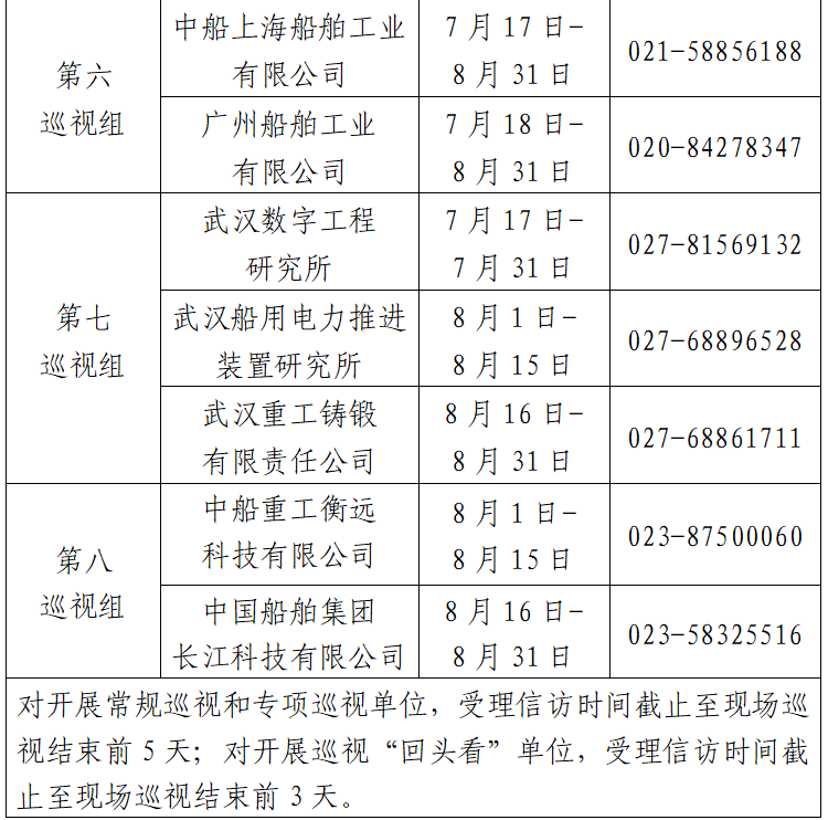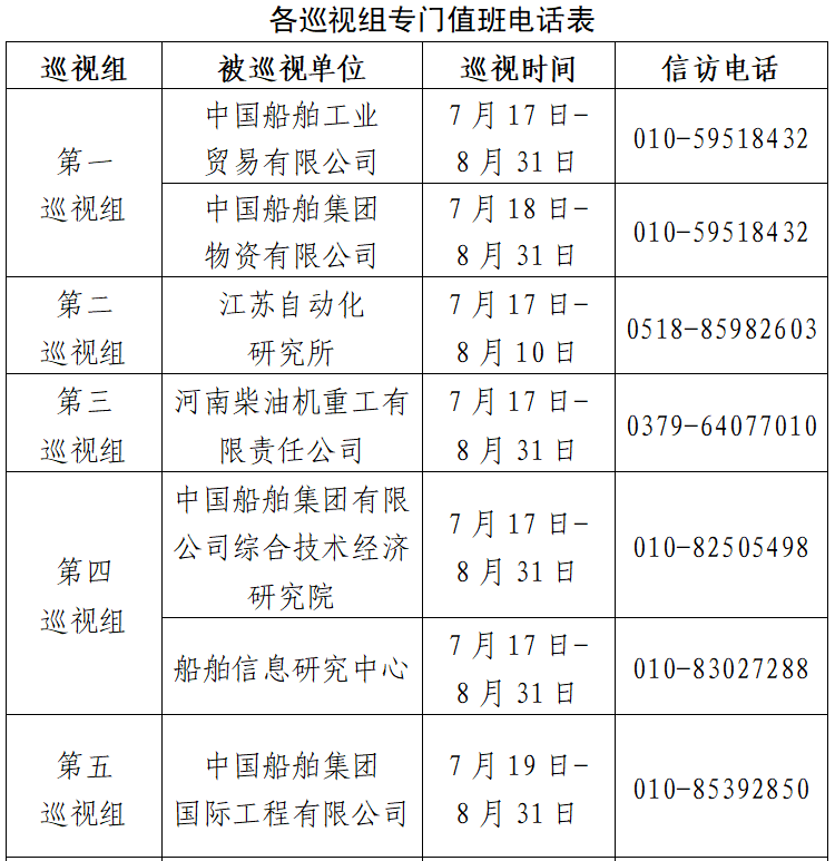 根據(jù)中國船舶集團黨組2023年第一輪巡視工作部署,截至2023年7月17日,巡視工作已經(jīng)鋪開。其中,對中國船舶工業(yè)貿(mào)易有限公司、中國船舶集團物資有限公司、江蘇自動化研究所、河南柴油機重工有限責任公司、中國船舶集團有限公司綜合技術經(jīng)濟研究院、船舶信息研究中心、中國船舶集團國際工程有限公司等7家單位開展常規(guī)巡視,對中船上海船舶工業(yè)有限公司、廣州船舶工業(yè)有限公司等2家單位開展專項巡視,對武漢數(shù)字工程研究所、武漢船用電力推進裝置研究所、武漢重工鑄鍛有限責任公司、中國船舶集團長江科技有限公司、中船重工衡遠科技有限公司等5家單位開展巡視“回頭看”。