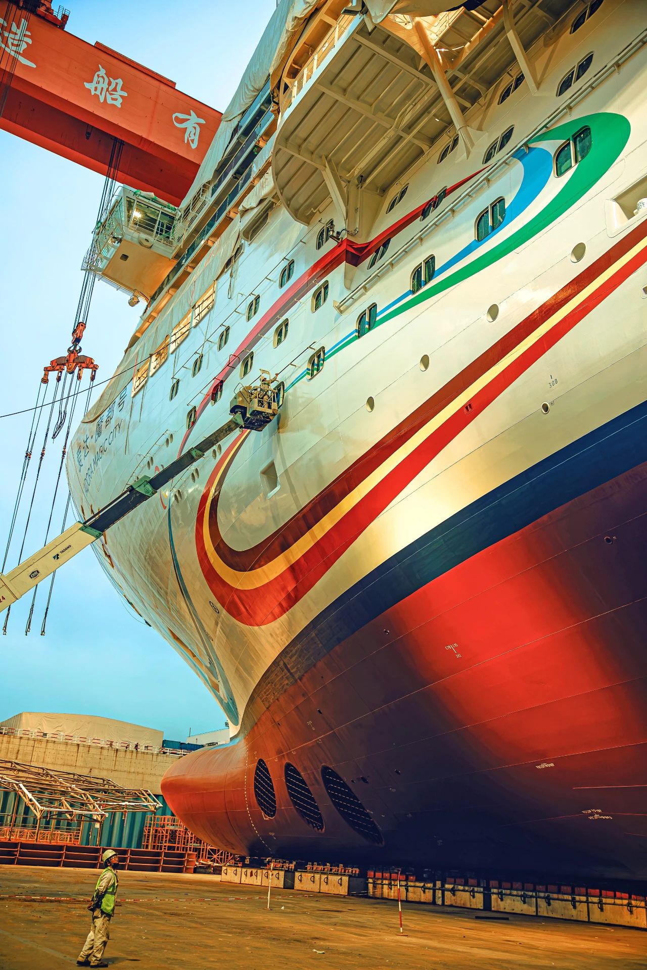 照片攝于國(guó)產(chǎn)首艘大型郵輪首次出塢前夕,拍攝時(shí)期為傍晚,船塢開啟燈光照明,工人在對(duì)船身做最后的涂裝修飾工作。這樣的角度觀看國(guó)產(chǎn)首艘大型郵輪令人無比震撼。