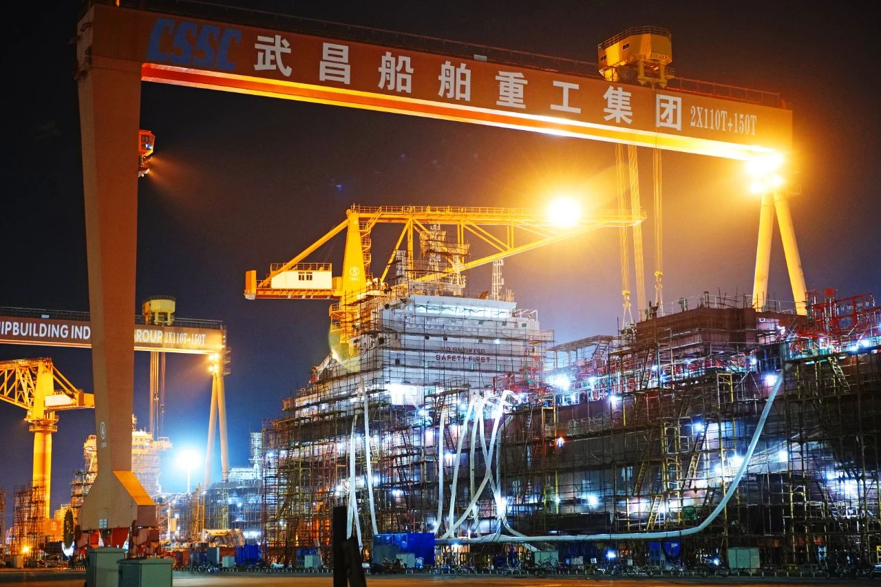 在武漢船機(jī)平臺(tái)總裝現(xiàn)場(chǎng),華夏金租神大平臺(tái)配套的1200噸起重機(jī)正在安裝,大件吊裝各項(xiàng)準(zhǔn)備工作繁瑣,一切就緒時(shí),天已經(jīng)黑了,現(xiàn)場(chǎng)一鼓作氣開始吊裝對(duì)接,展現(xiàn)了船舶人只爭(zhēng)朝夕、不負(fù)韶華、忘我工作精神風(fēng)貌。