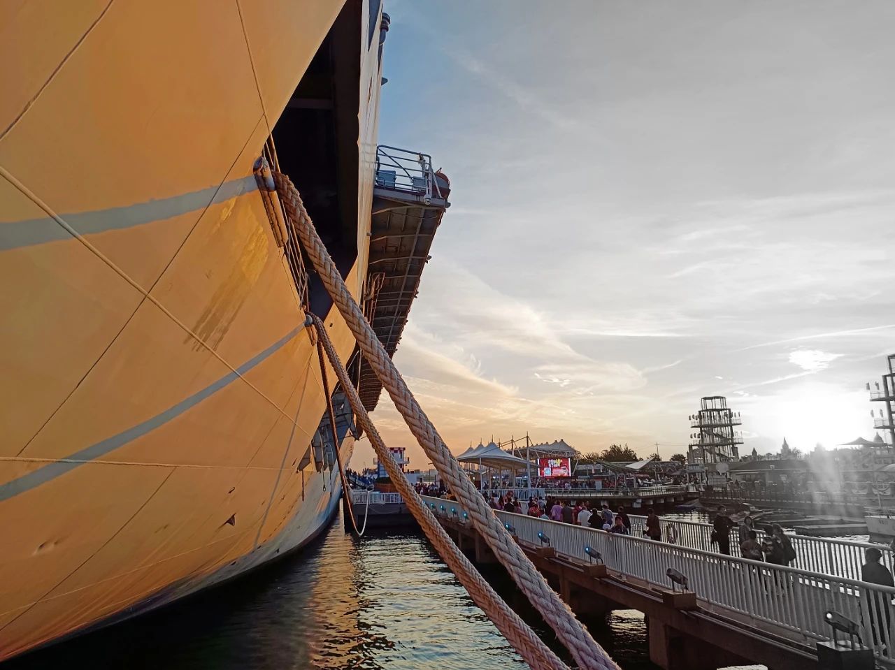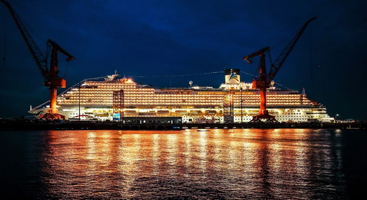 國(guó)產(chǎn)首艘國(guó)產(chǎn)大型郵輪“愛達(dá)·魔都號(hào)”,停靠在長(zhǎng)江口,燈光電路測(cè)試期間,華燈綻放恍如白晝。