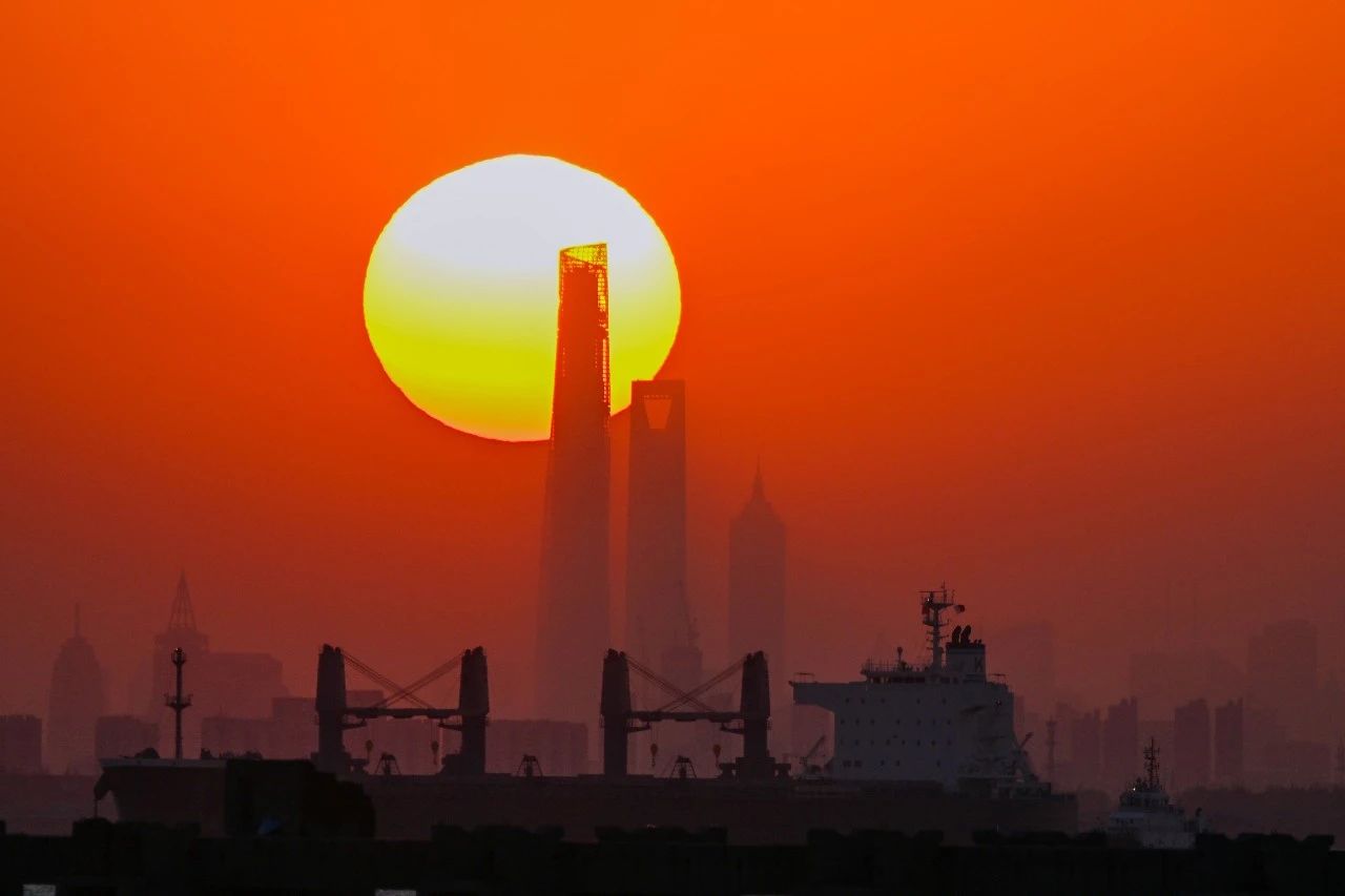 從距離陸家嘴33公里遠(yuǎn)的橫沙島上遠(yuǎn)眺“三件套”,夕陽從“三件套”穿過,此時(shí)一艘船駛?cè)氘嬅妫c夕陽形成近中遠(yuǎn)三景。