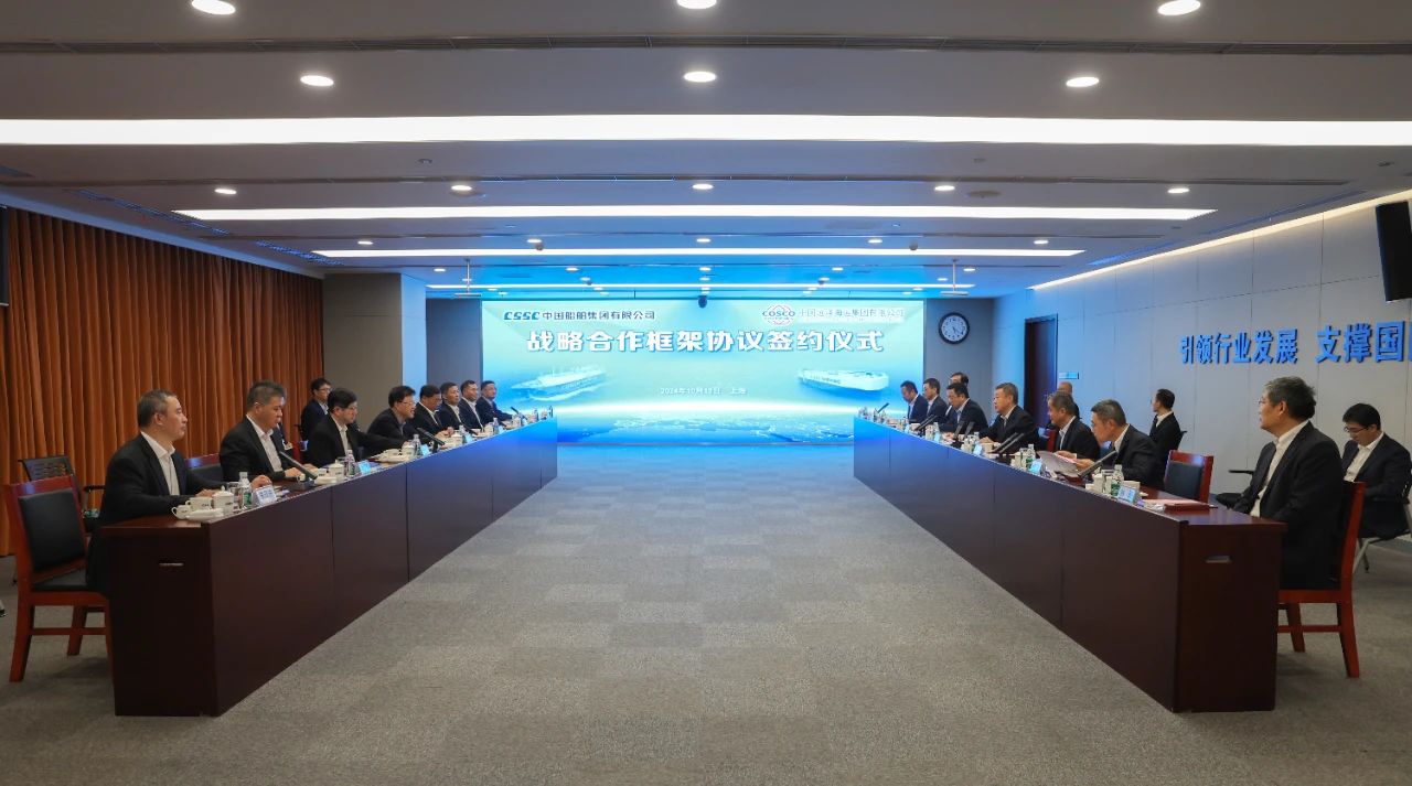 10月15日,中國(guó)船舶集團(tuán)有限公司與中國(guó)遠(yuǎn)洋海運(yùn)集團(tuán)有限公司在上海簽訂戰(zhàn)略合作框架協(xié)議。中國(guó)船舶集團(tuán)黨組書記、董事長(zhǎng)溫剛,中遠(yuǎn)海運(yùn)集團(tuán)黨組書記、董事長(zhǎng)萬(wàn)敏,黨組副書記、總經(jīng)理朱碧新出席簽約儀式。中國(guó)船舶集團(tuán)黨組成員、副總經(jīng)理盛紀(jì)綱,紀(jì)檢監(jiān)察組組長(zhǎng)、黨組成員彭宏,中遠(yuǎn)海運(yùn)集團(tuán)黨組成員、副總經(jīng)理、總會(huì)計(jì)師孫云飛出席簽約儀式。盛紀(jì)綱和孫云飛分別代表雙方在協(xié)議上簽字。簽約前,雙方就進(jìn)一步加強(qiáng)溝通交流、深化多領(lǐng)域合作進(jìn)行了交流探討。
