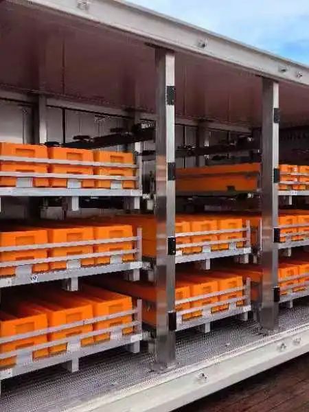 # 露天甲配置了船載巖心集裝箱自動裝載系統(tǒng),能夠在集裝箱和電梯之間自動轉(zhuǎn)移托盤;