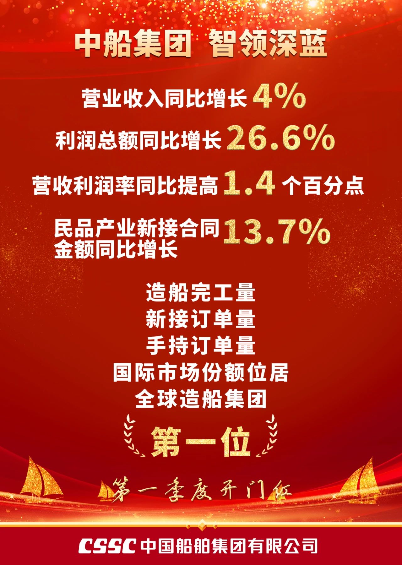 一季度,中船集團(tuán)營(yíng)業(yè)收入同比增長(zhǎng)4%,利潤(rùn)總額同比增長(zhǎng)26.6%,營(yíng)收利潤(rùn)率同比提高1.4個(gè)百分點(diǎn),民品產(chǎn)業(yè)新接合同金額同比增長(zhǎng)13.7%,造船完工量、新接訂單量、手持訂單量國(guó)際市場(chǎng)份額位居全球造船集團(tuán)第一位,收獲首季開(kāi)門(mén)紅。