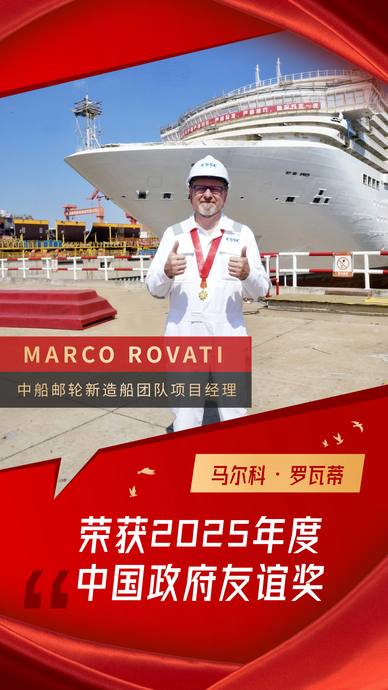 MARCO ROVATI是一位出生于1967年的克羅地亞籍郵輪工程專家,擁有超過三十年的郵輪新造船經(jīng)驗(yàn)。在獲得中國政府友誼獎(jiǎng)后,MARCO ROVATI說:“中國政府友誼獎(jiǎng)是我職業(yè)生涯中獲得的最重要的榮譽(yù),對我而言具有非凡意義。這份獎(jiǎng)項(xiàng)不僅是對我過去工作的認(rèn)可,更是對我未來的激勵(lì)。我將繼續(xù)為中國郵輪產(chǎn)業(yè)的發(fā)展貢獻(xiàn)自己的力量。”