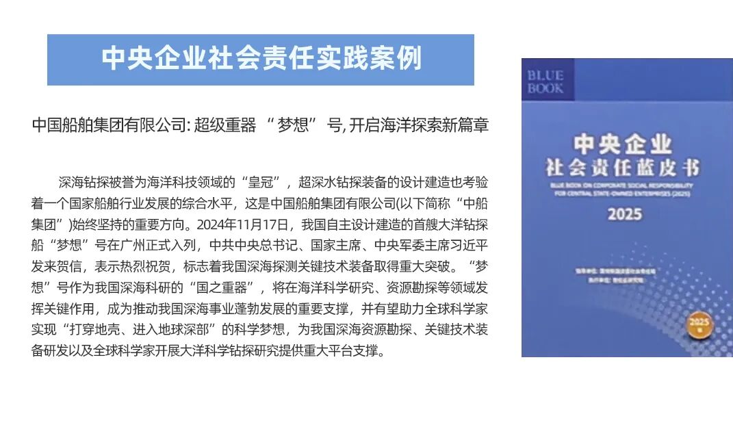 中船集團(tuán)申報(bào)的《超級重器“夢想”號,開啟海洋探索新篇章》,聚焦國之重器建造歷程,闡述了“夢想”號在海洋科學(xué)研究、深海資源勘探等領(lǐng)域的關(guān)鍵作用,成功入選《中央企業(yè)社會(huì)責(zé)任藍(lán)皮書(2025)》中央企業(yè)社會(huì)責(zé)任實(shí)踐案例。