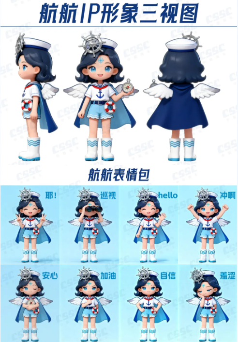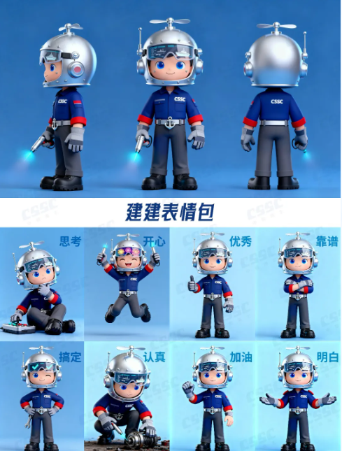 建建(造船擔當)以銀色防護頭盔(嵌船舶零件電子屏、印艦船剪影)、船錨腰帶、CSSC工裝及焊槍,凸顯造船匠心精神;航航(航行擔當)憑船舵頭飾、導航羅盤、海鷗披風與船錨上衣,傳遞中船航行使命。二者以 “建造 - 航行” 閉環(huán),具象中船全鏈條實力,彰顯中船文化。