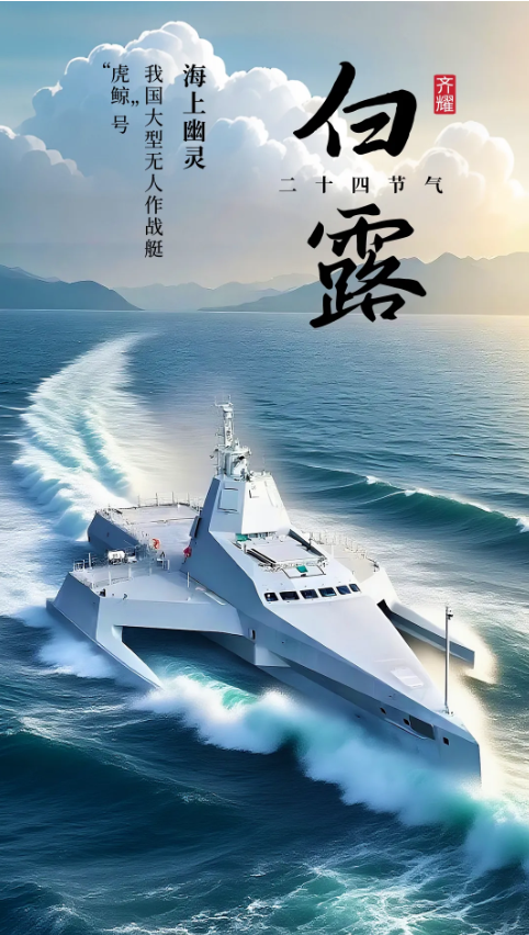 該海報以即夢AI為筆,繪就了一場跨越時空的對話,將“白露”的清冷賦予“海上幽靈”無人艇的鋒芒。