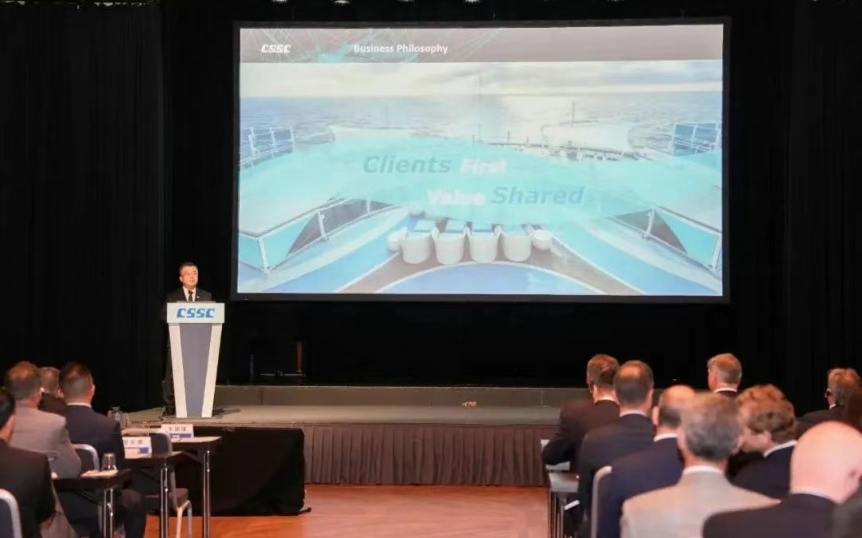 王國強向全球主要船東和合作伙伴宣講了“中船集團 智領(lǐng)深藍”的企業(yè)品牌理念,闡述了中船集團未來十年的“高端化、綠色化、智能化、共享化”戰(zhàn)略規(guī)劃方向,以及與全球廣大船東用戶“開放合作、共創(chuàng)共贏”的經(jīng)營理念。他強調(diào),作為全球船舶市場綠色低碳發(fā)展的引領(lǐng)者、踐行者和先行者,中船集團始終堅持創(chuàng)新驅(qū)動的發(fā)展理念,以構(gòu)建海洋命運共同體為使命,持續(xù)加快核心技術(shù)協(xié)同攻關(guān),不斷深化與全球航運企業(yè)及國際海事界的多贏合作。