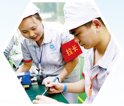 華鎣市一家企業(yè)的生產(chǎn)線負責人唐定燕(左),向徒弟講解生產(chǎn)技術。周松林攝