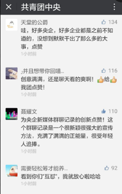 中國人民大學(xué)新聞學(xué)院教授宋建武認(rèn)為,“央企新媒體群聊記錄”的走紅,是因為真實、接地氣、參與感強,“每個人都有群聊的經(jīng)歷,這種方式使人們感覺親切、有趣”,公眾需要和喜聞樂見才是它能夠吸引人、感染人的原因。