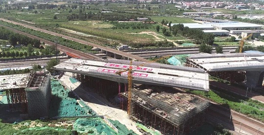 ????該工程上跨鄭焦城際、京廣鐵路等3條線(xiàn)5股道,每天有140對(duì)高鐵列車(chē)和貨運(yùn)列車(chē)擦肩而過(guò),轉(zhuǎn)體橋與鐵路線(xiàn)的最近距離只有8.7米,加上該工程橋梁全長(zhǎng)317米,寬38.7米,轉(zhuǎn)體懸臂長(zhǎng)71.75米,單側(cè)轉(zhuǎn)體橋梁重達(dá)3萬(wàn)噸,鐵路東、西兩側(cè)轉(zhuǎn)體橋梁總重達(dá)6萬(wàn)噸,體量大,風(fēng)險(xiǎn)高,施工難度可想而知。為確??傊亓窟_(dá)6萬(wàn)噸的轉(zhuǎn)體橋精準(zhǔn)對(duì)接,重點(diǎn)在于球鉸的制作、安裝,轉(zhuǎn)體過(guò)程中應(yīng)力應(yīng)變、位移與線(xiàn)性的實(shí)時(shí)監(jiān)測(cè)。本次成功應(yīng)用的轉(zhuǎn)動(dòng)體系采用鋼球鉸,由雙瑞特裝設(shè)計(jì)、制造、安裝及轉(zhuǎn)體施工,解決了大噸位橋梁轉(zhuǎn)體裝置超大承載力,靈活轉(zhuǎn)動(dòng)的難題。