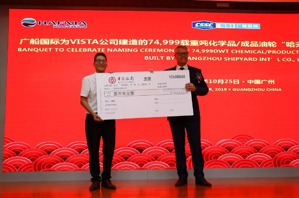 10月25日,廣船國際有限公司為VISTA公司建造的7.5萬噸化學品/成品油船4號船命名交付。這是廣船國際在“決戰(zhàn)120天,掀起生產(chǎn)高潮”勞動競賽中收獲的又一枚勝利果實。該船比合同交船期提前43天交付,船東為此專門獎勵廣船國際1萬美元。