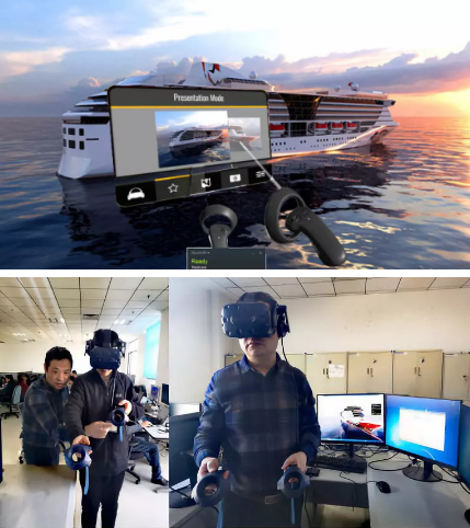 ????該平臺通過總體總師與三維造型師的協(xié)同交互,完成全船三維設(shè)計(jì)(全船造型和艙室內(nèi)部裝飾等)并搭建逼真場景,用戶通過穿戴智能頭顯,操縱控制手柄,真正實(shí)現(xiàn)了“漫步甲板、穿行船艙”的自主漫游體驗(yàn)。