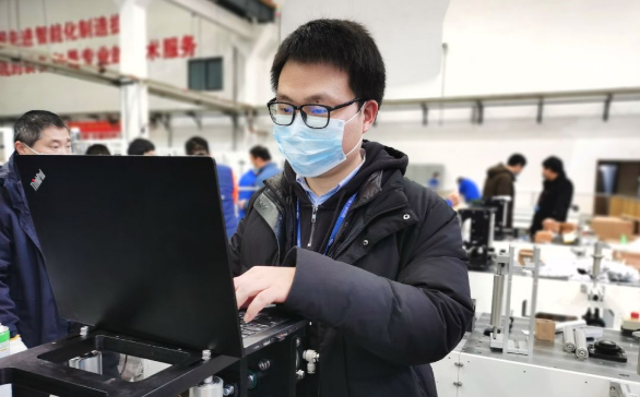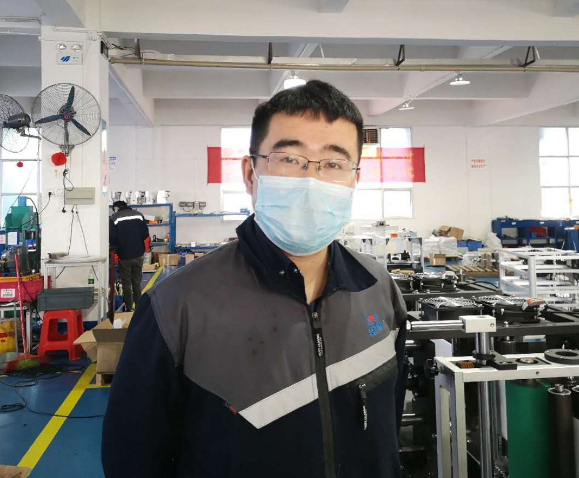 ????徐存培是平面口罩機(jī)項(xiàng)目的技術(shù)負(fù)責(zé)人。自接到平面口罩機(jī)研制任務(wù)以來(lái),他幾乎就“長(zhǎng)”在公司里了。他穿梭在各臺(tái)平面口罩機(jī)間,一會(huì)兒墊腳測(cè)量放料架距離地面的高度,一會(huì)兒彎腰擰緊設(shè)備柜里的螺絲,一會(huì)兒又緊盯著傳送帶,看無(wú)紡布貼合的角度是否精準(zhǔn)無(wú)誤……