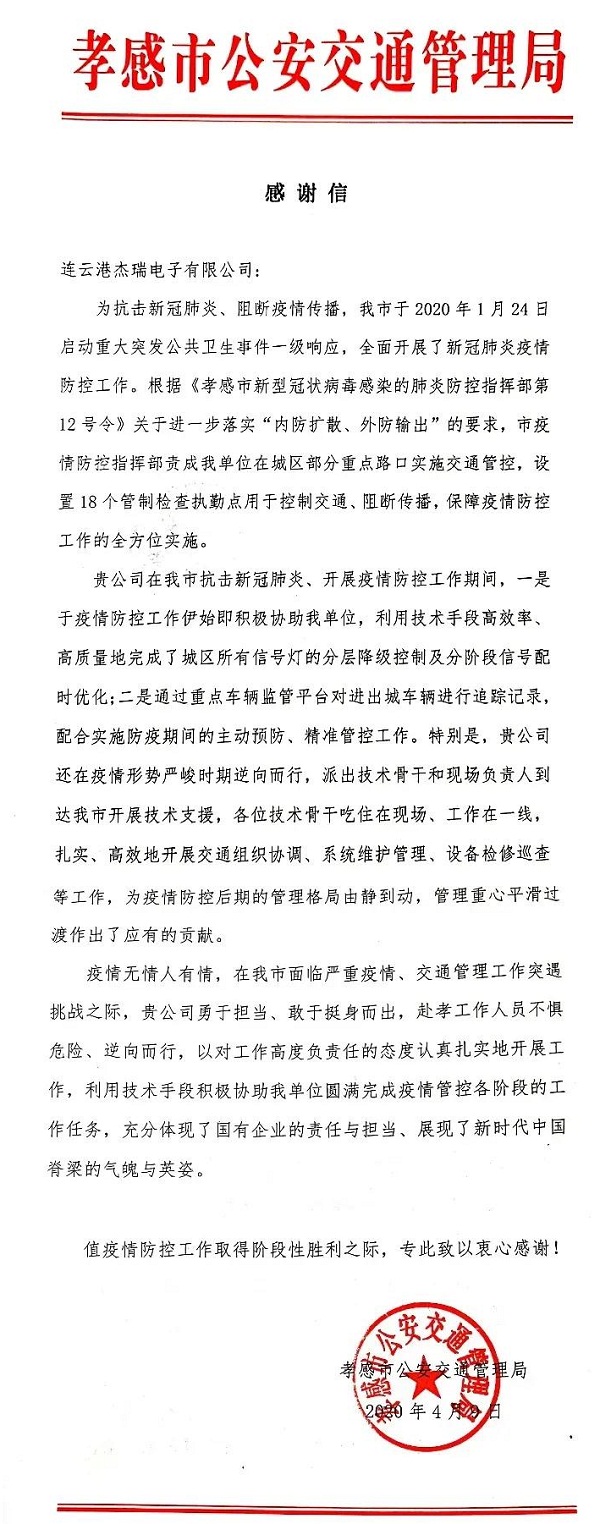 ????中國船舶集團七一六所下屬杰瑞電子公司收到湖北省孝感市公安交通管理局發(fā)來的感謝信,對杰瑞電子赴孝感工作人員不懼危險、逆向而行,以高度負責(zé)任的態(tài)度,利用技術(shù)手段,積極協(xié)助疫情防控工作表示感謝。