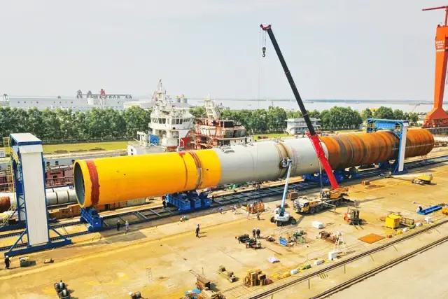 ???日前剛向大家介紹了中國船舶集團(tuán)旗下黃埔文沖建造的單樁穩(wěn)樁平臺(tái)主體工程順利成型,就在昨天又交付一海上風(fēng)電產(chǎn)品海上風(fēng)電單樁。4月14日,黃埔文沖船舶下屬文船重工公司交付了為保利長大工程有限公司建造的首個(gè)海上風(fēng)電單樁。該單樁直徑8.8米,長103.4米,最大板厚85毫米,重1644.3噸,已經(jīng)達(dá)到一艘輕型護(hù)衛(wèi)艦的重量,是目前世界上最大的風(fēng)電單樁之一。