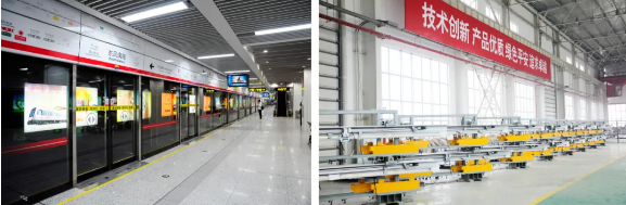 左圖:鄭州地鐵1號(hào)線使用七一三所軌道交通站臺(tái)門系統(tǒng);右圖:七一三所軌道交通站臺(tái)門門機(jī)系統(tǒng)生產(chǎn)現(xiàn)場(chǎng)