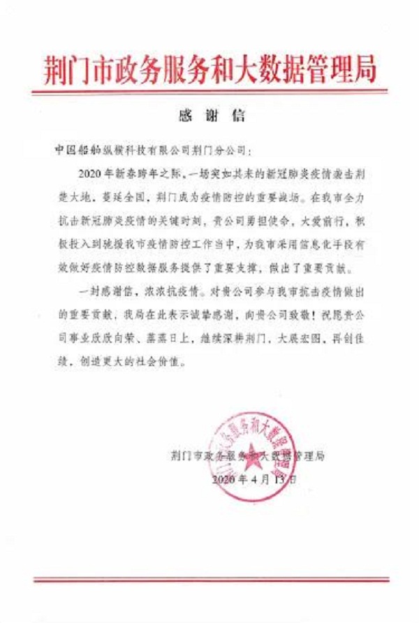 ????中國船舶集團(tuán)七一〇所縱橫公司荊門分公司收到荊門市政務(wù)服務(wù)和大數(shù)據(jù)管理局寄來的感謝信,感謝其在抗擊新冠肺炎疫情的關(guān)鍵時(shí)刻,為荊門市采用信息化手段有效做好疫情防控?cái)?shù)據(jù)服務(wù)提供了重要支撐,作出了重要貢獻(xiàn)。