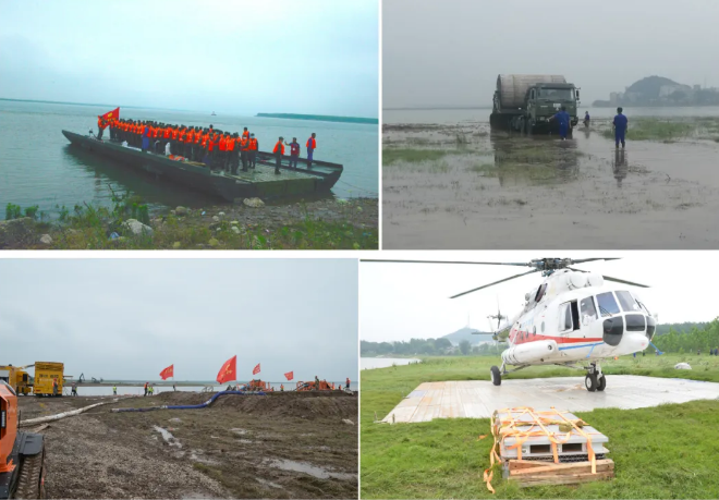 ????在搜救環(huán)節(jié),中船應急搶險隊架設動力舟橋和硬質機動路面進行道路搶通,保障重型裝備及人員進場;在內澇搶排環(huán)節(jié),采用應急泄流虹吸裝備和履帶式排澇機器人參與排澇搶險;在重大險情處置環(huán)節(jié),鋪設應急直升機停機坪保障直升機起降,并實施潰口封堵作業(yè)。