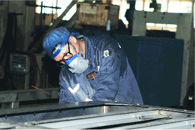中船應(yīng)急電焊工正在進行電焊加工,全然無覺后背濕了大片。