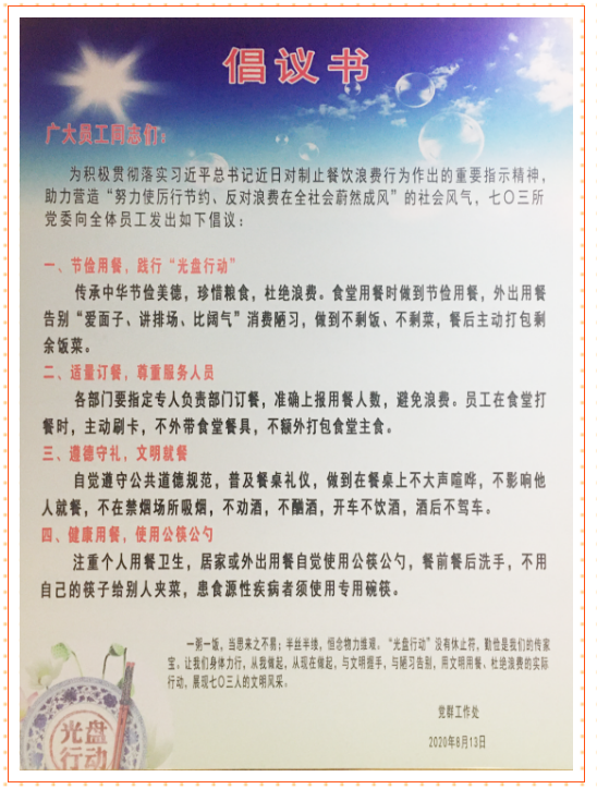 連日來(lái),中國(guó)船舶集團(tuán)多家成員單位積極踐行習(xí)近平總書(shū)記對(duì)制止餐飲浪費(fèi)行為的重要指示精神,進(jìn)一步加強(qiáng)宣傳教育,培養(yǎng)節(jié)約習(xí)慣。首先刊載有特色的宣傳海報(bào)、條幅,