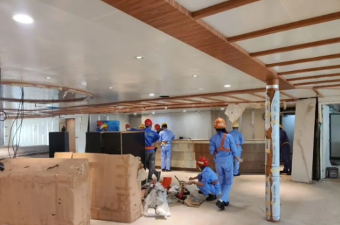 這是廣船國際阿爾及利亞豪華客滾輪內(nèi)裝收尾現(xiàn)場(chǎng)。