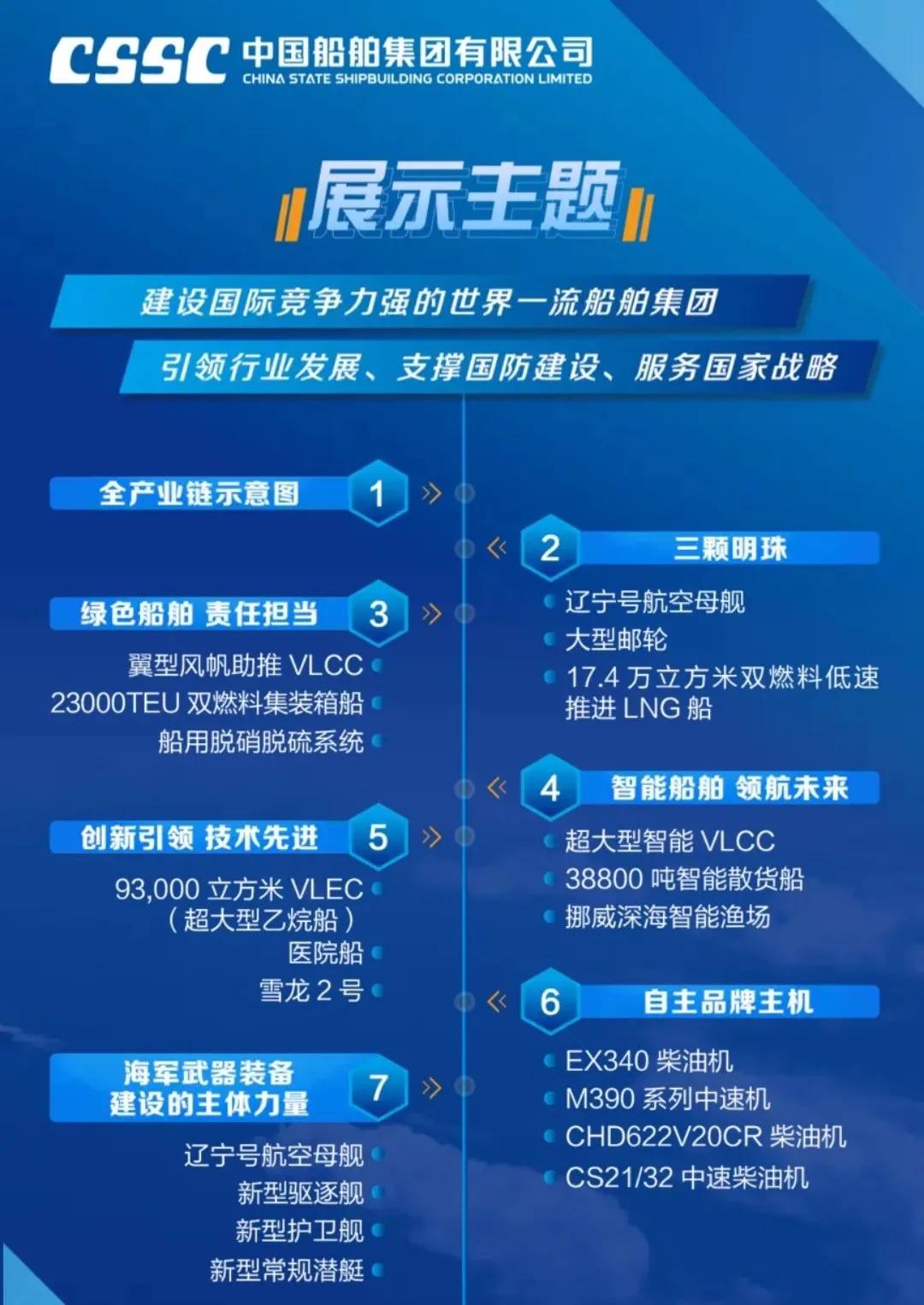 總體展區(qū) 中國船舶集團(tuán)展示了代表著世界造船工業(yè)最高水平的航空母艦、大型郵輪、液化天然氣(LNG)船“皇冠上的三顆明珠”,充分彰顯具備設(shè)計(jì)建造符合全球船級(jí)社規(guī)范、滿足國際通用技術(shù)標(biāo)準(zhǔn)和安全公約要求的產(chǎn)品的能力。圍繞“綠色 智能 創(chuàng)新”主題,特別設(shè)置了3個(gè)主題展臺(tái),重點(diǎn)展示23000TEU雙燃料集裝箱船、超大型智能超大型油船(VLCC)、挪威深海智能漁場(chǎng)、9.8萬立方米超大型乙烷運(yùn)輸船(VLEC)、“雪龍2”號(hào)等9型產(chǎn)品,彰顯出中國船舶集團(tuán)貫徹落實(shí)“創(chuàng)新、協(xié)調(diào)、綠色、開放、共享”新發(fā)展理念的實(shí)踐。