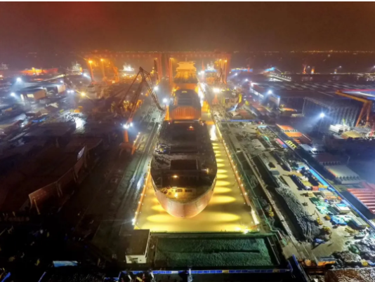 ——第二次改造,2018年10月至2020年6月,再次接長200米,建成后總長達(dá)740米。通過中間塢門分別形成前后兩個獨立塢室,以滿足年產(chǎn)1.5艘大型郵輪及3艘VLCC綱領(lǐng)產(chǎn)品要求。