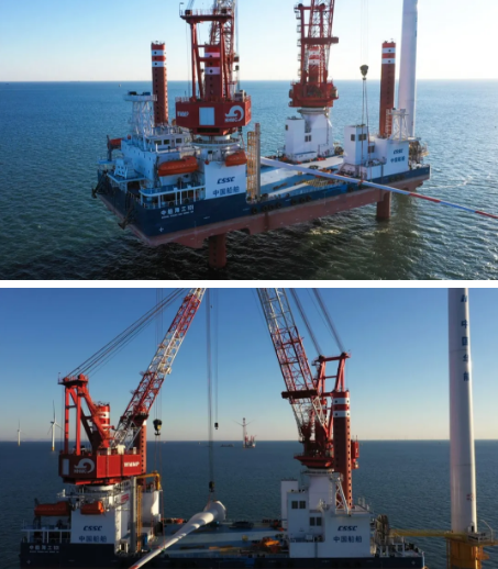 中國船舶集團(tuán)建造的“中船海工101”號(hào)風(fēng)電安裝平臺(tái)正在海上作業(yè)
