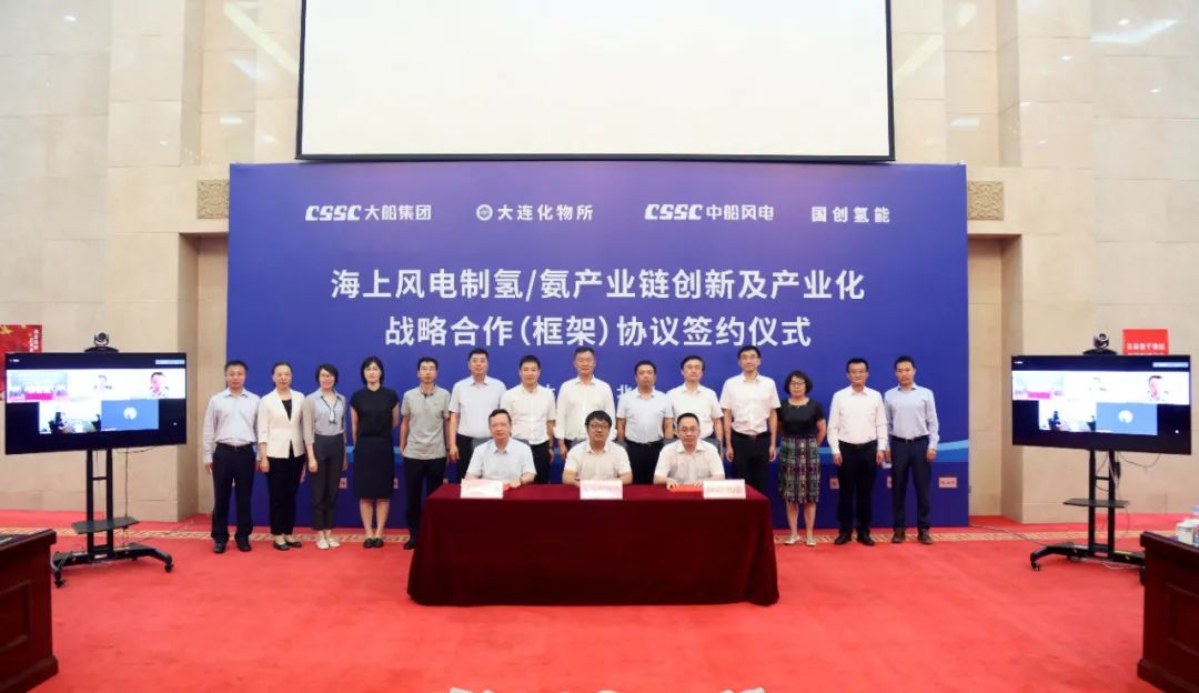 8月6日,中國船舶集團旗下大船集團舉行《海上風電制氫/氨產(chǎn)業(yè)鏈創(chuàng)新及產(chǎn)業(yè)化戰(zhàn)略合作(框架)協(xié)議》簽約儀式。大船集團與大連化物所、國創(chuàng)氫能、中船風電四方代表在協(xié)議書上簽字。