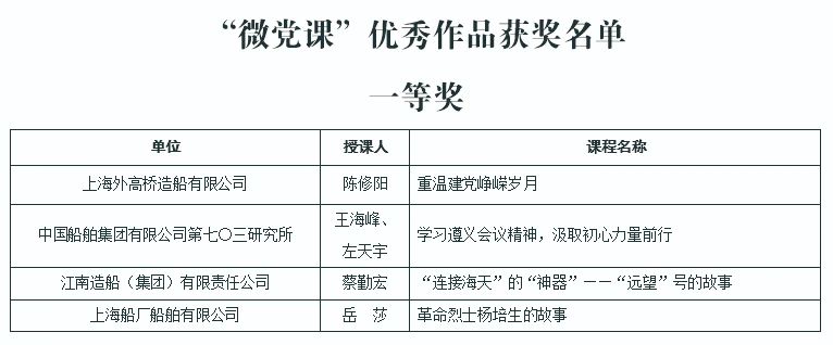 為慶祝中國共產(chǎn)黨成立100周年,深入推進(jìn)黨史學(xué)習(xí)教育,由中國船舶集團(tuán)黨群工作部主辦,中國船舶集團(tuán)黨校承辦的慶祝中國共產(chǎn)黨成立100周年黨課評(píng)選活動(dòng)結(jié)果今天正式揭曉。