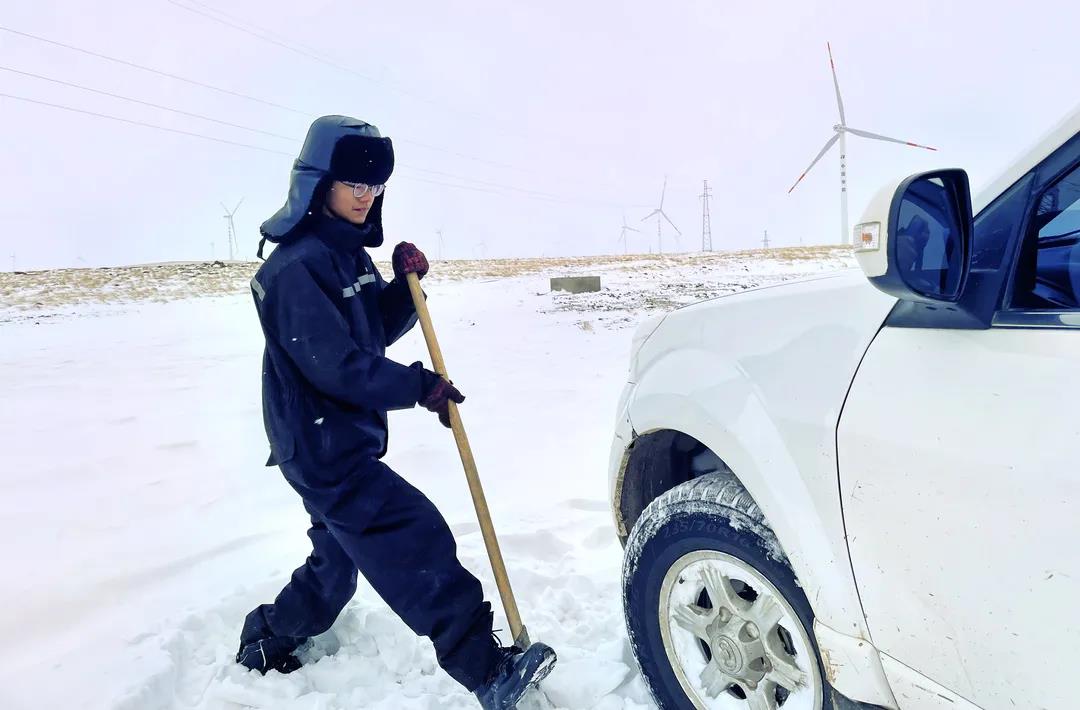 進入11月,內(nèi)蒙古自治區(qū)錫林郭勒盟地區(qū)迎來大面積的暴風(fēng)雪,烏達(dá)萊項目人員在趕往風(fēng)場的路上遭遇積雪路段,雖然氣候嚴(yán)寒,但為了及時消除機組故障,大家在積雪路段采取挖雪推車的方式齊心協(xié)力,一同開展清理路面積雪的行動。這個冬日,冰雪阻擋不住海裝追風(fēng)者們勇往直前的步伐,他們只為恪盡職守完成一個承諾——風(fēng)機旋轉(zhuǎn)、帶來光熱。