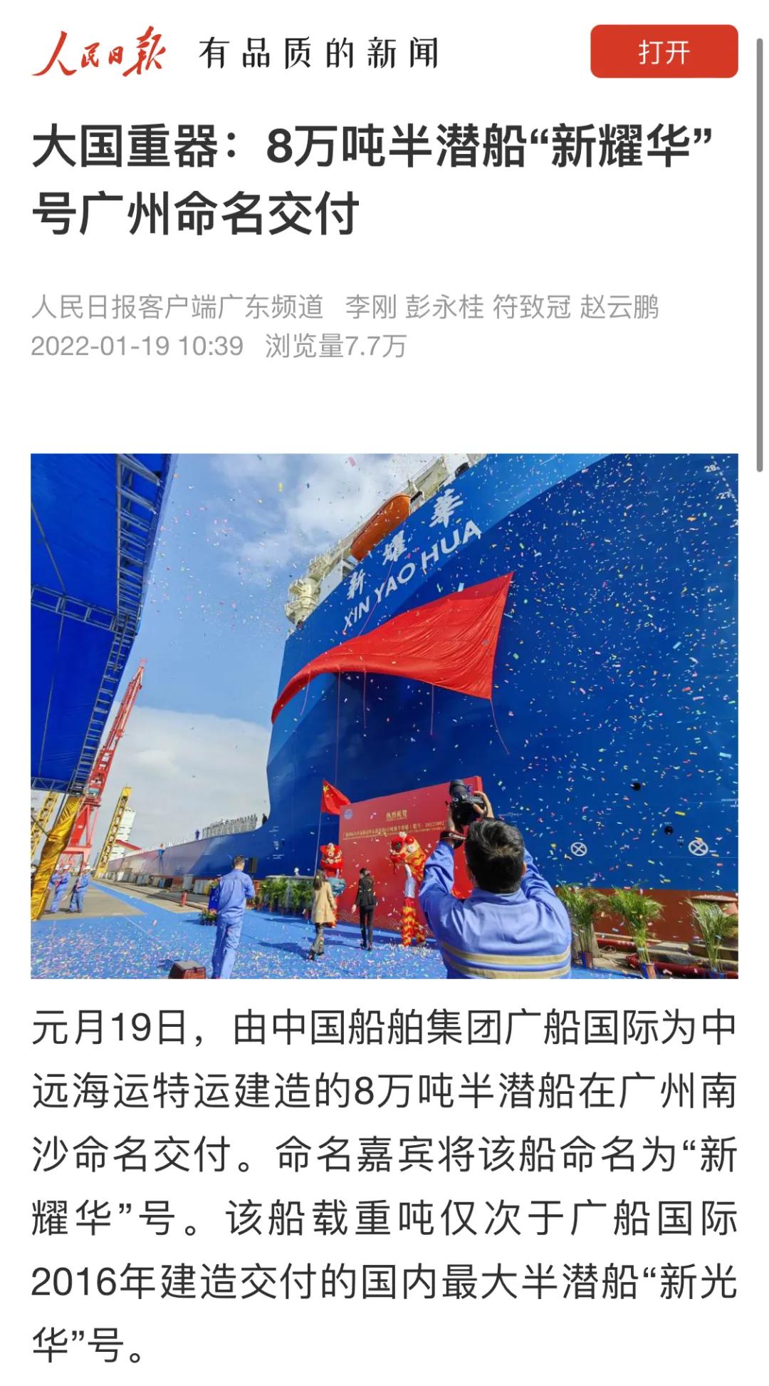 1月19日,由中國船舶集團旗下廣船國際建造的8萬噸半潛船“新耀華”號命名交付。