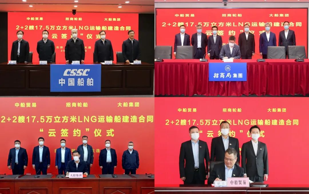 3月31日,中國船舶集團有限公司旗下大船集團聯(lián)合中船貿(mào)易與招商局集團有限公司旗下招商輪船在上海、深圳、大連及北京四地以“云簽約”方式簽署2+2艘17.5萬立方米大型液化天然氣(LNG)運輸船建造合同。中國船舶集團黨組書記、董事長雷凡培,黨組副書記、總經(jīng)理楊金成,黨組成員、副總經(jīng)理盛紀綱,招商局集團董事長繆建民、總經(jīng)理胡建華、董事王宏出席簽約儀式。雷凡培、繆建民在儀式上致辭。