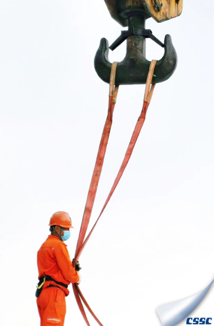 一名船舶起重工正在準(zhǔn)備起吊直徑10米、重約5噸的玻璃鋼材質(zhì)頂部圓盤至船舶上安裝,正值“梅花”過境后的陰雨天氣,身穿橙色工作服的船舶起重工在橙色吊帶、玻璃鋼材質(zhì)圓盤以及灰色天空下,構(gòu)筑了一幅簡約而又濃墨重彩的線條與內(nèi)容相輔相成,彰顯了船舶工業(yè)之美、勞動光榮之美。